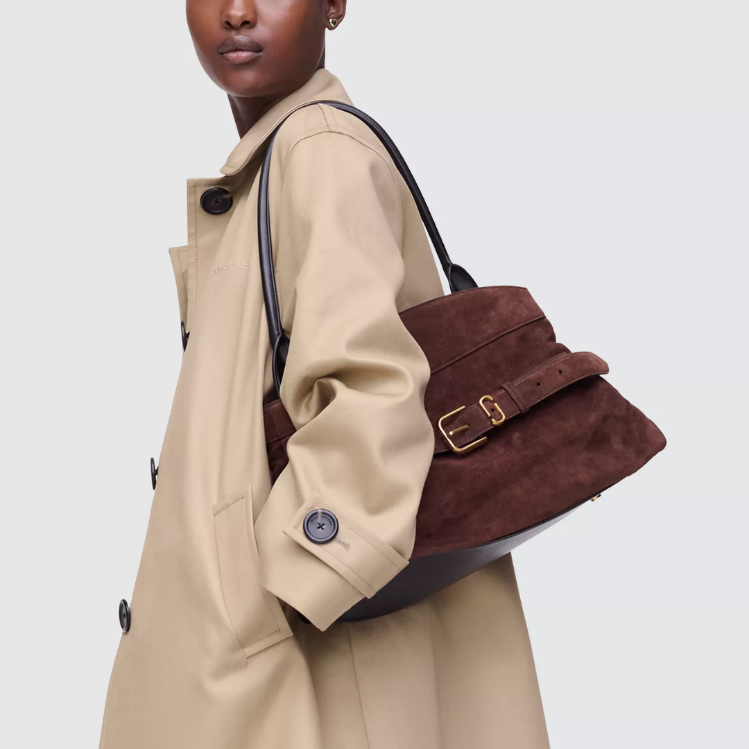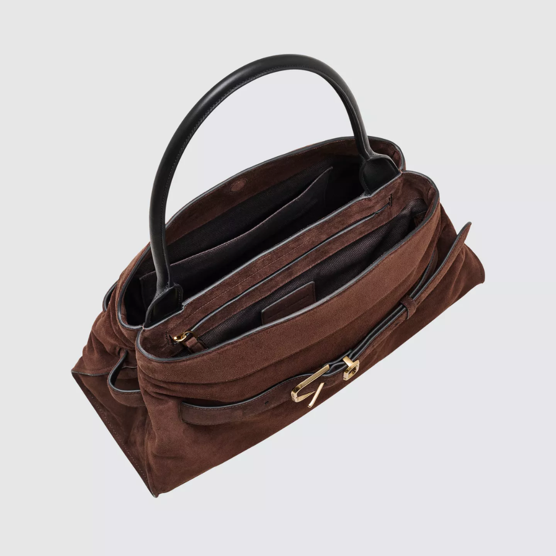 A refined balance of structure and ease, the Dakota Satchel merges utility with quiet sophistication. Crafted in rich suede, it’s defined by a fixed J Marc logo belt. Thoughtfully designed, it features a magnetic closure, two interior compartments and considered pockets that speak to everyday practicality. Metal feet ground the design, while a top handle adds a sculptural finish.